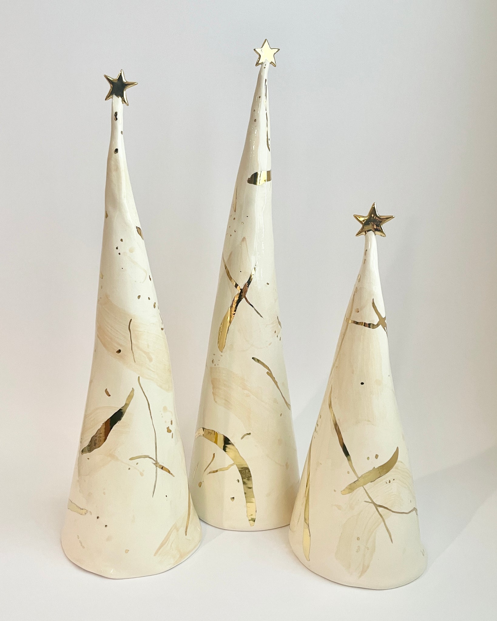This ceramic tree trio is approximately 11-17 inches in height. Each tree is handmade, adorned in ivory beige and 22K gold brushstrokes. Each tree is unique and a labor of love with beauty in the imperfections. They are designed to be collectible and they look great mixed and matched. I hope you add to your collection year after year and I know they will bring years of holiday enjoyment to your home decor.
