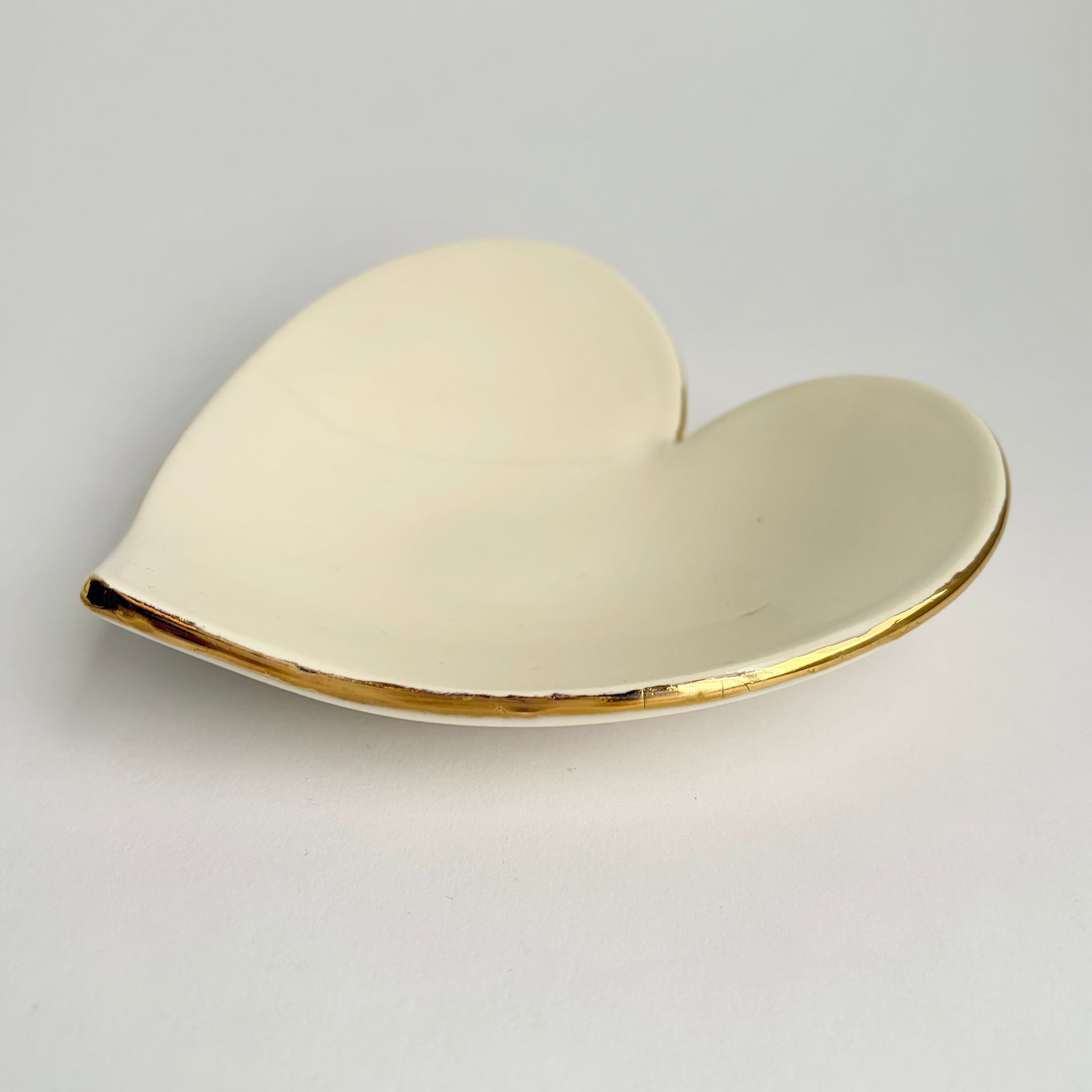 This one of a kind ivory ceramic heart plate is approximately 5.5-6 inches. These are great for decoration, jewelry, or other special baubles. This plate is handmade with love and glazed with 22k gold. These dishes will go through the kiln up to three times and each piece is signed on the back.
