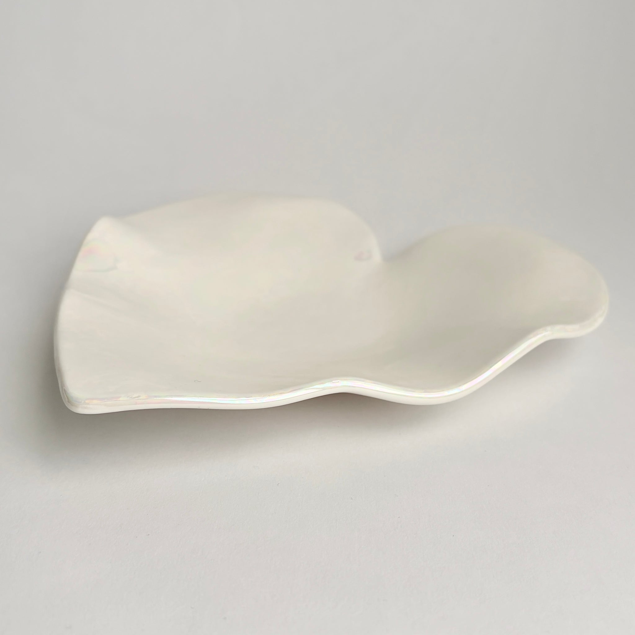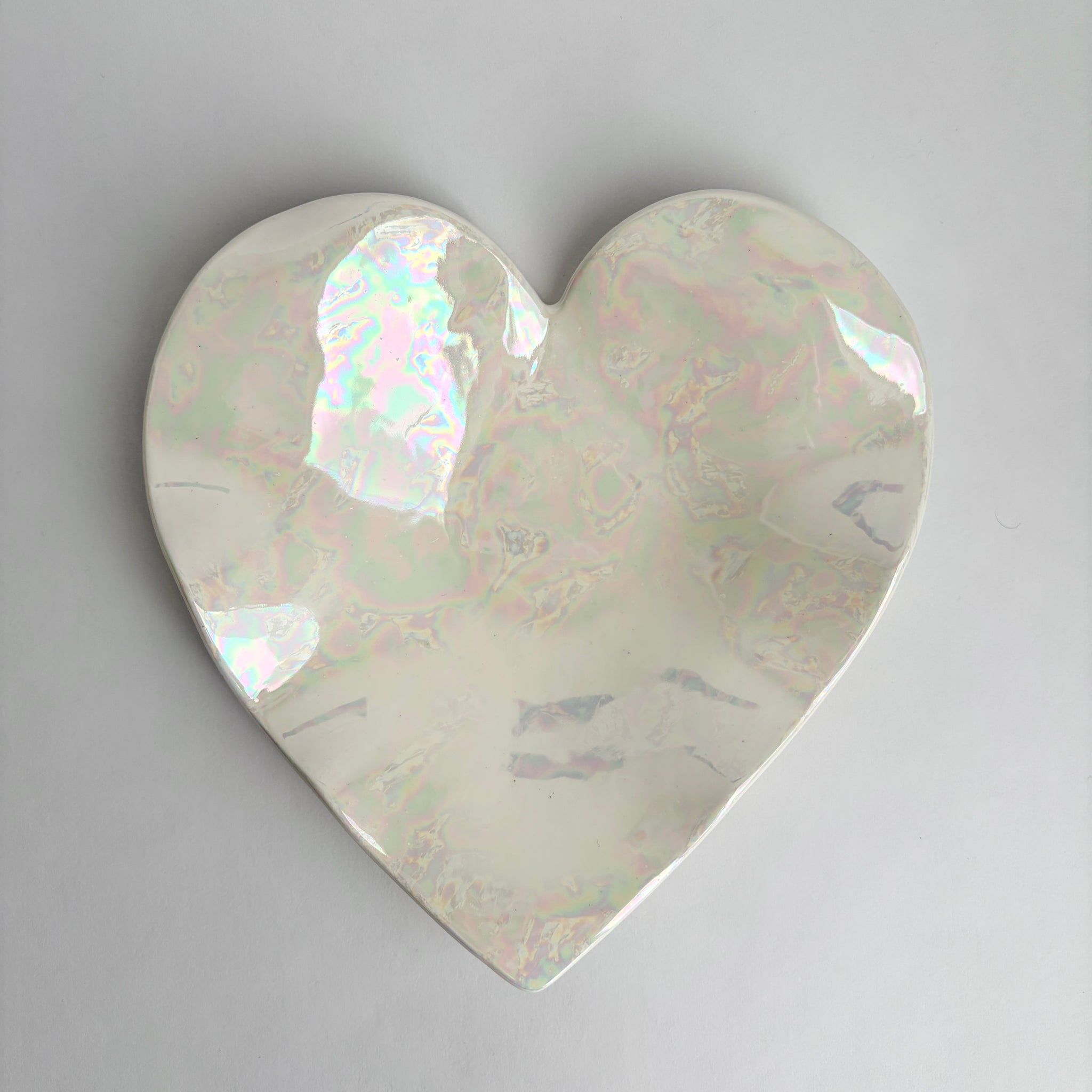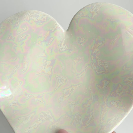This one of a kind white ceramic heart plate is approximately 7.5-8 inches. These are great for decoration, jewelry, or other special baubles. This plate is handmade with love and glazed with real Mother-of-Pearl. These dishes will go through the kiln up to three times and each piece is signed on the back.