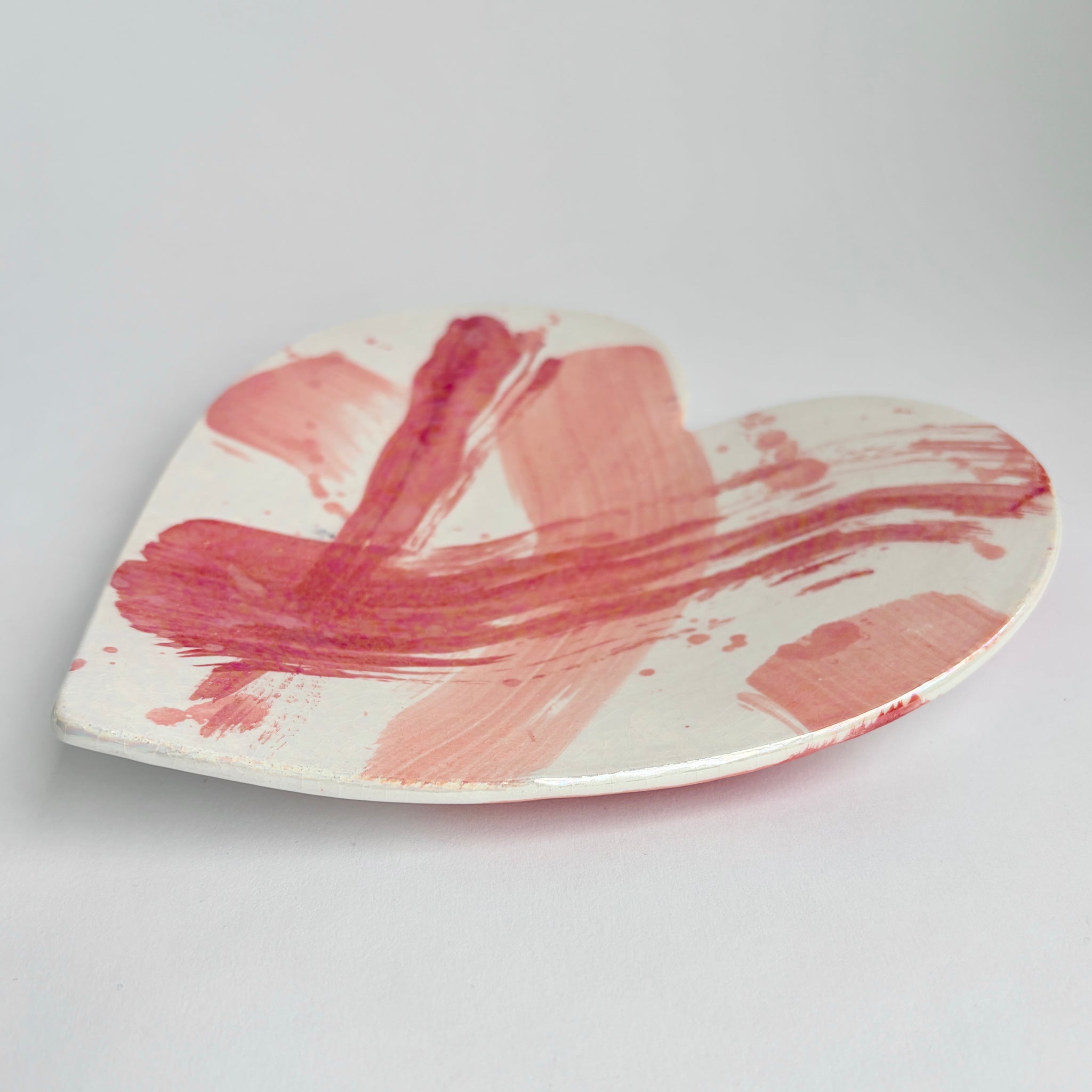 This one of a kind red, pink, and white brushstroke ceramic heart plate is approximately 7.5-8 inches. These are great for decoration, jewelry, or other special baubles. This plate is handmade with love and glazed in pinks and reds with real Mother-of-Pearl luster over the top. These dishes will go through the kiln up to three times and each piece is signed on the back.