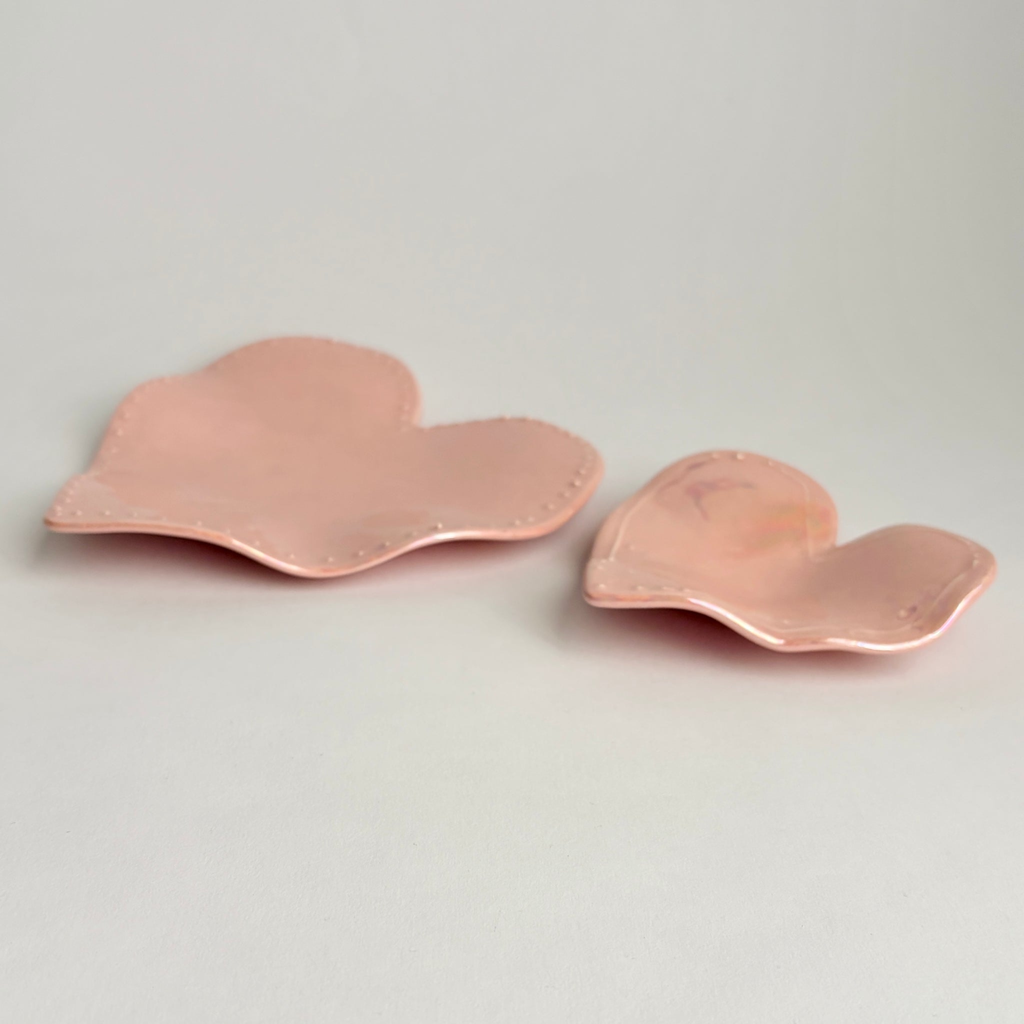 This one of a kind set of two pink ceramic heart plates measure approximately 5.5-6 inches and 3.5-4 inches. These are great for decoration, jewelry, or other special baubles. These plates are handmade with love and glazed with real Mother-of-Pearl. These dishes will go through the kiln up to three times and each piece is signed on the back.