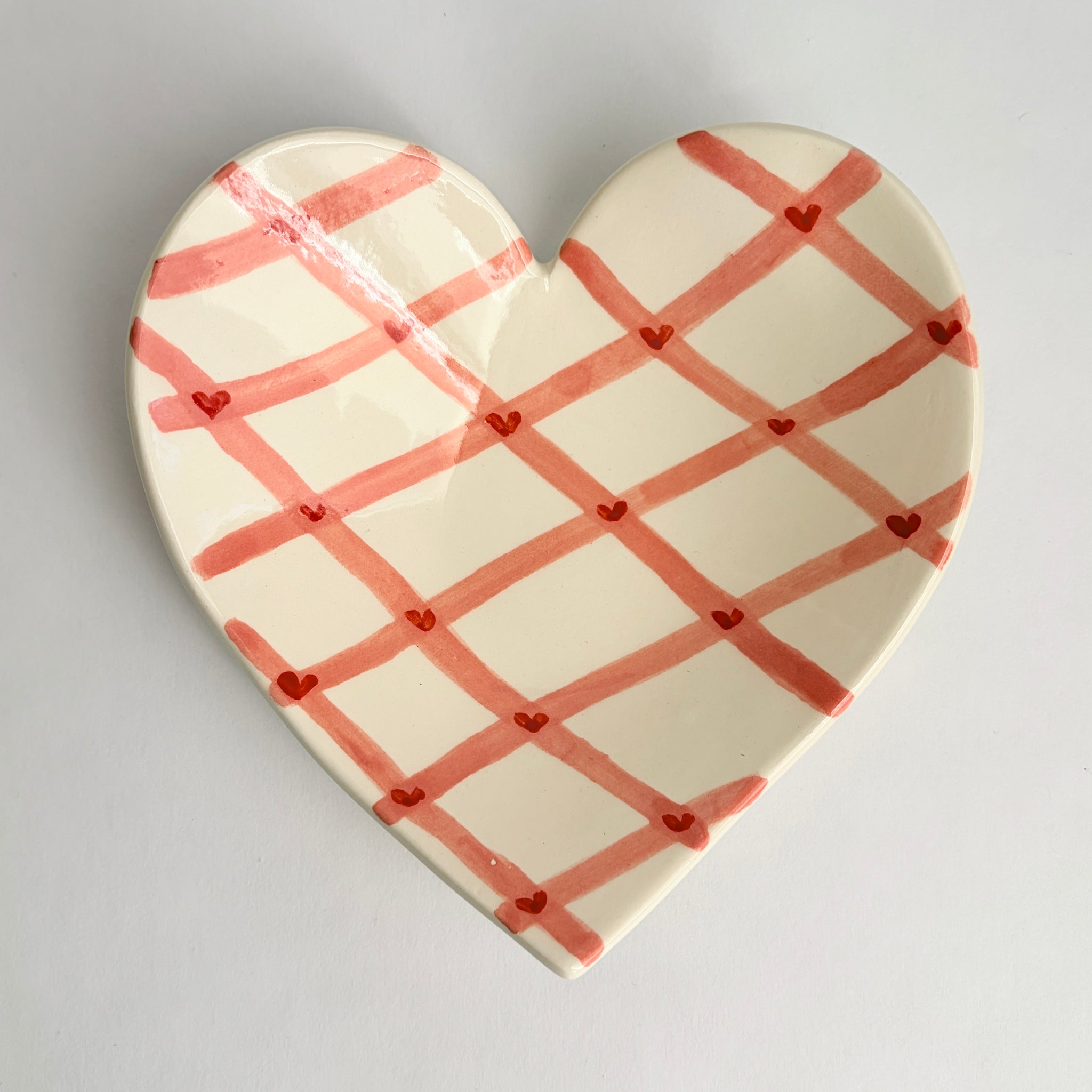 This one of a kind ceramic heart plate is approximately 5.5-6 inches. These are great for decoration, jewelry, or other special baubles. This plate is handmade with love and glazed with a pink and red diamond pattern. These dishes will go through the kiln up to three times and each piece is signed on the back.